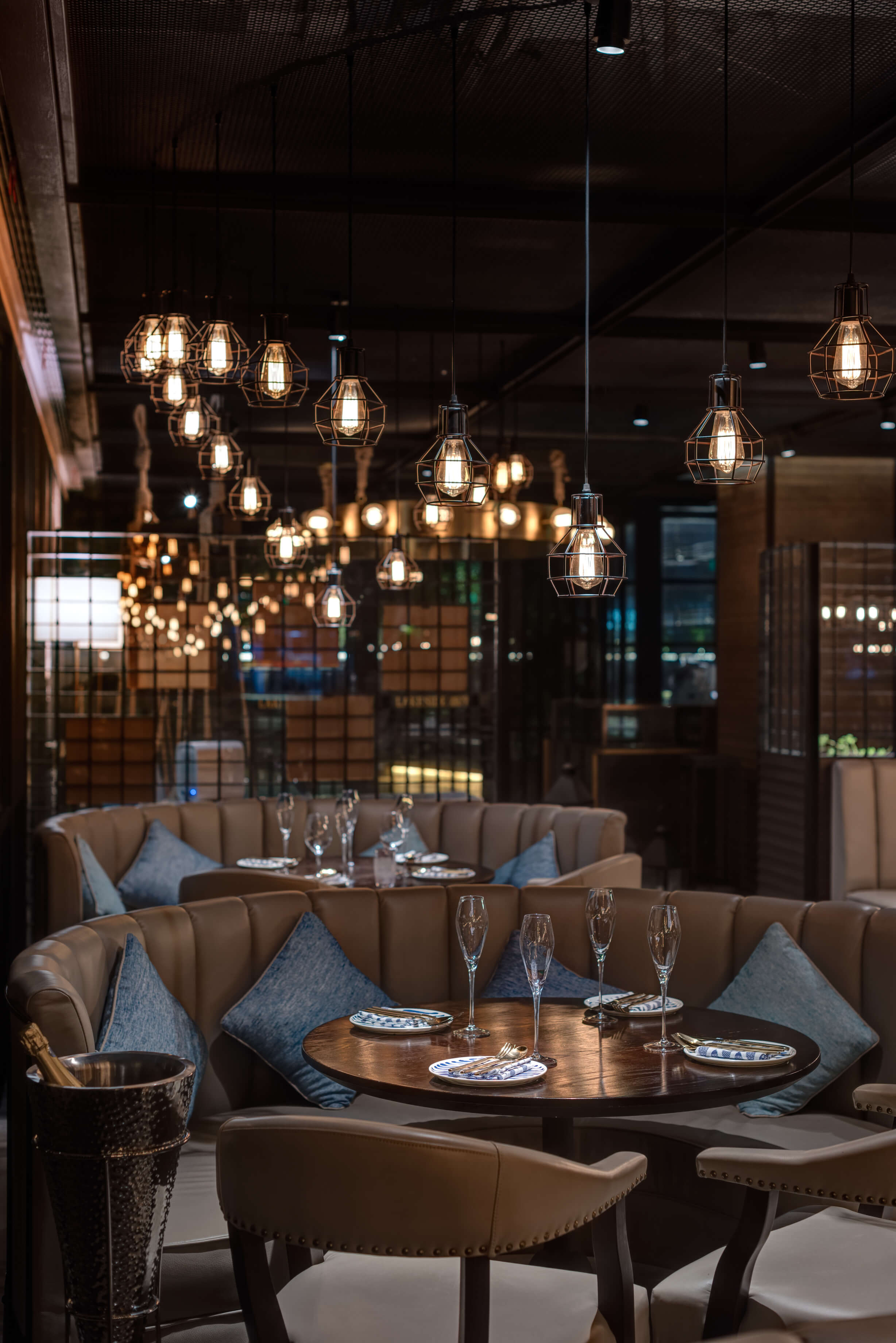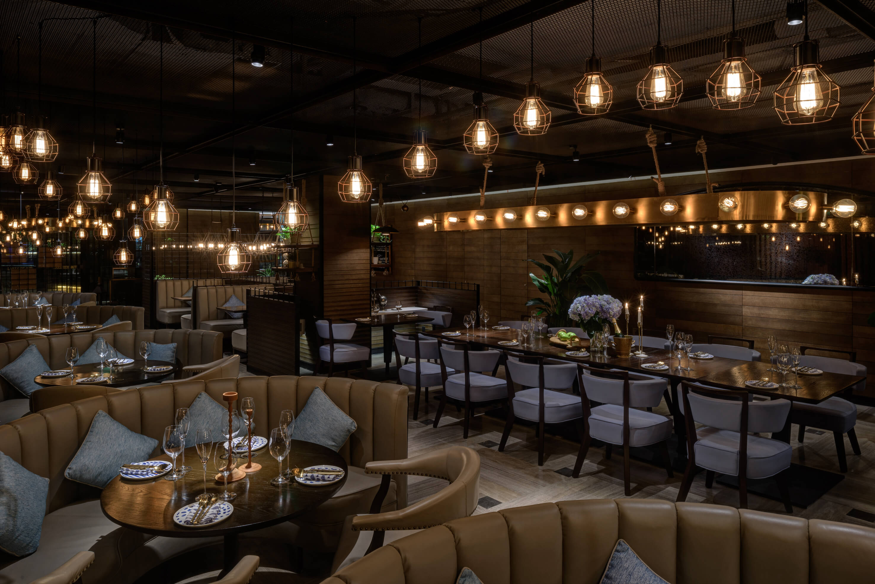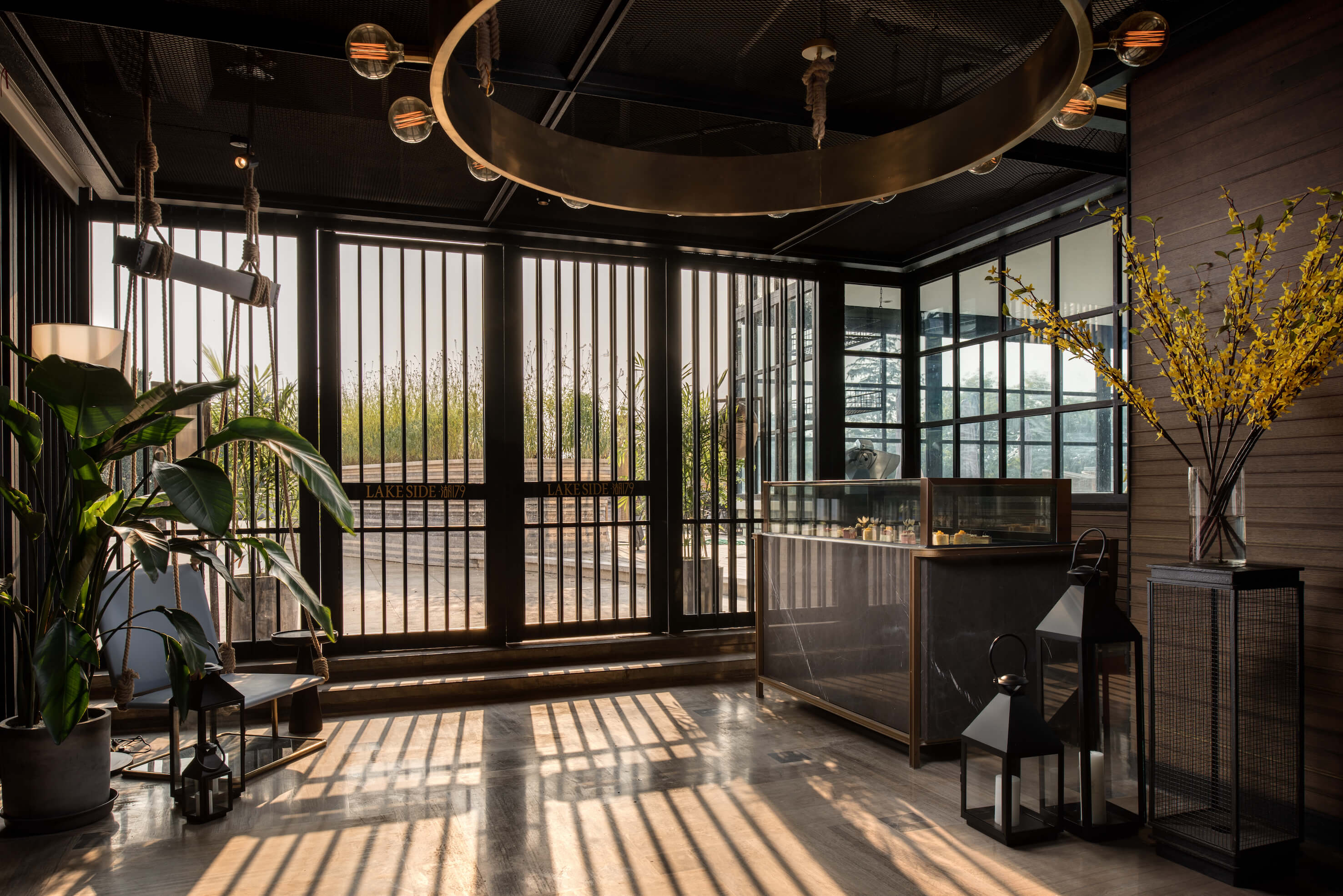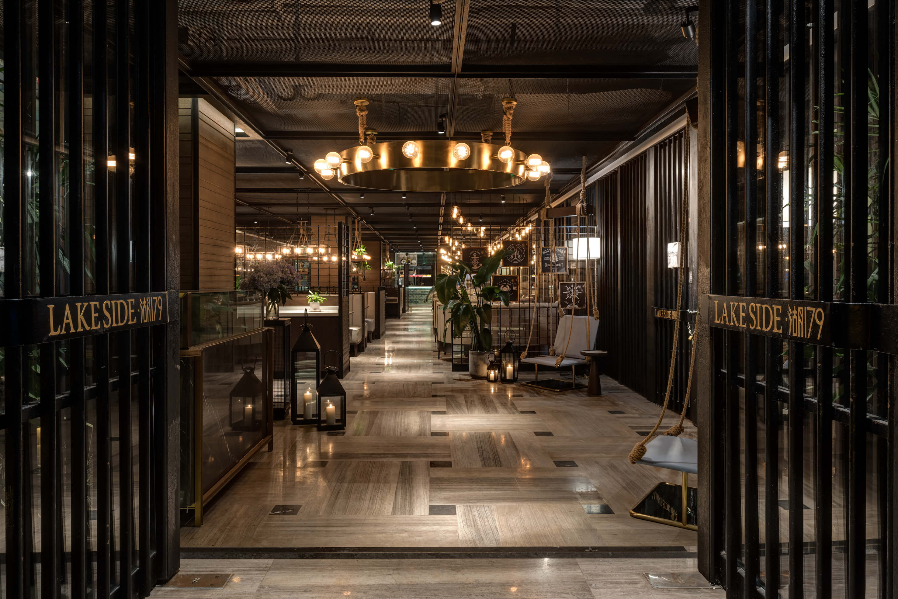 Before entering the restaurant, a corridor with lattice wooden feature wall creates a secluded sense of arrival, exuding a contrasting yet tuneful sensory experience, as through the guests are voyaging amongst the glistering water.