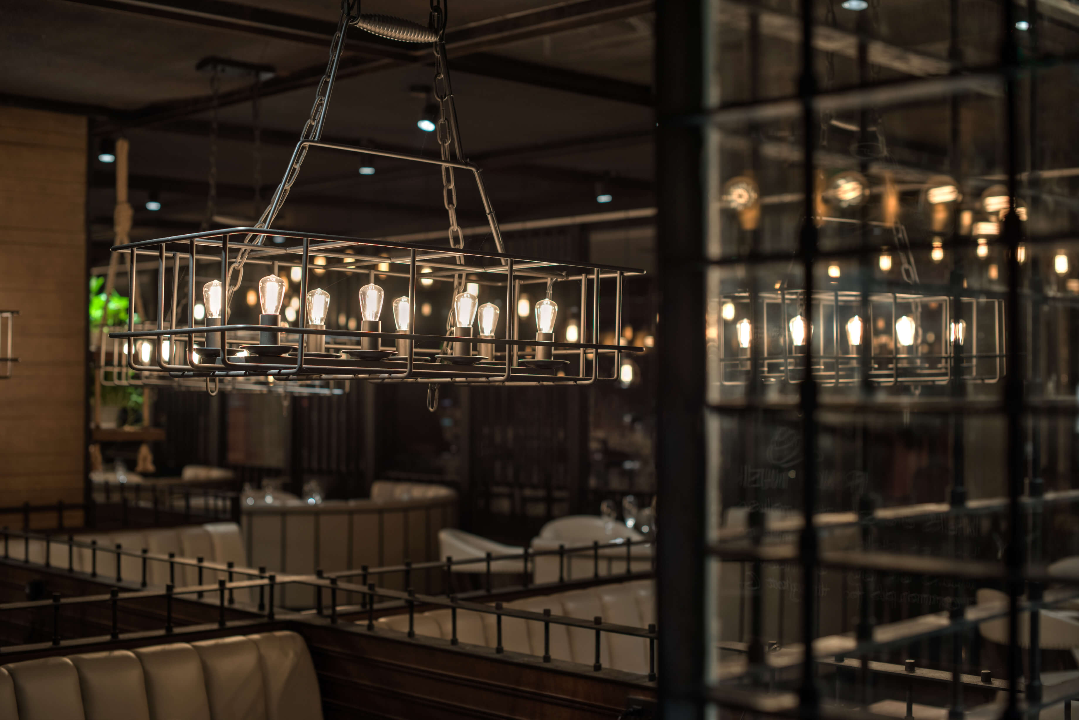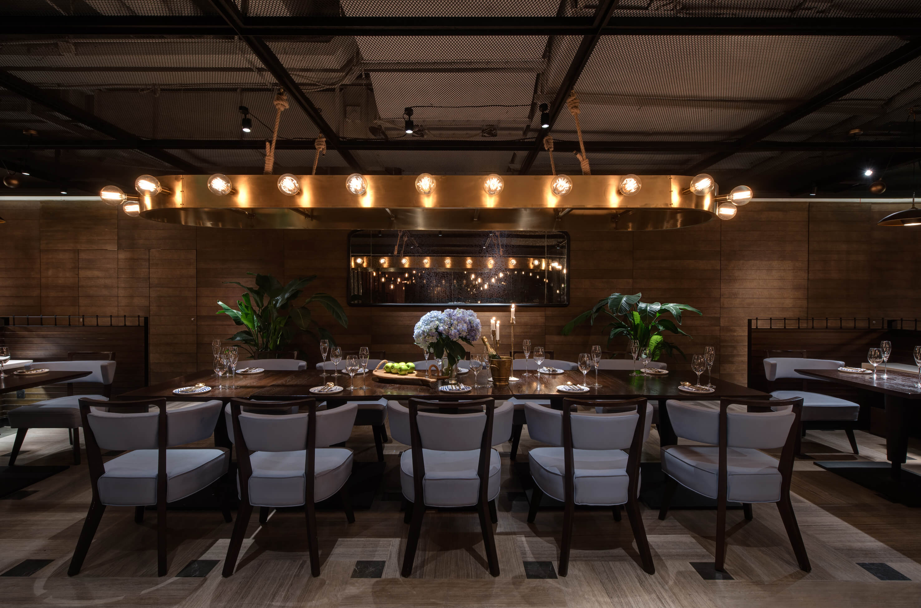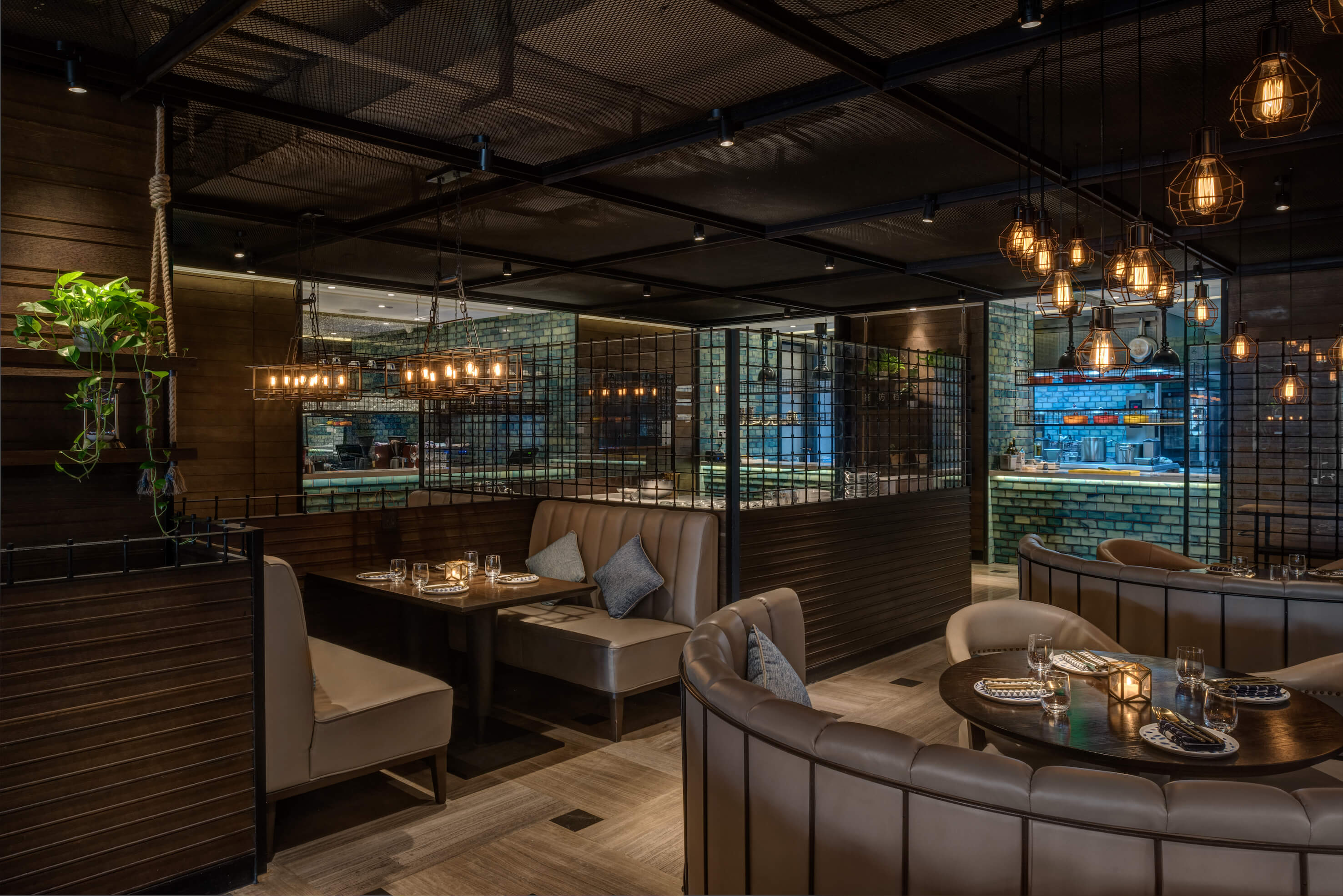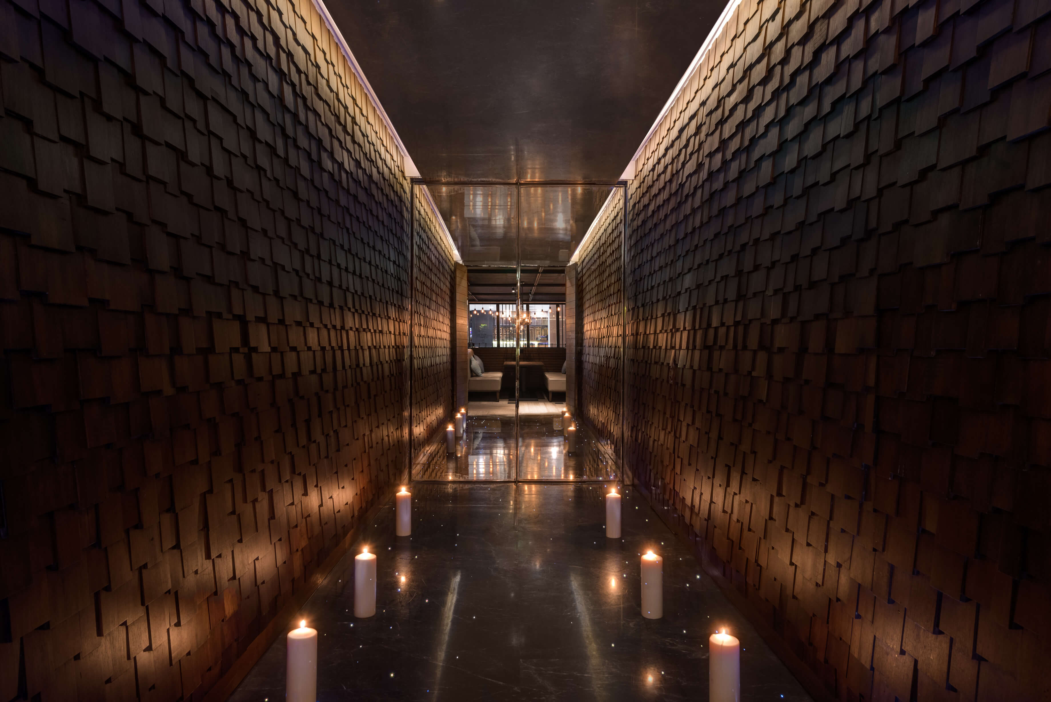 Before entering the restaurant, a corridor with lattice wooden feature wall creates a secluded sense of arrival, exuding a contrasting yet tuneful sensory experience, as through the guests are voyaging amongst the glistering water.