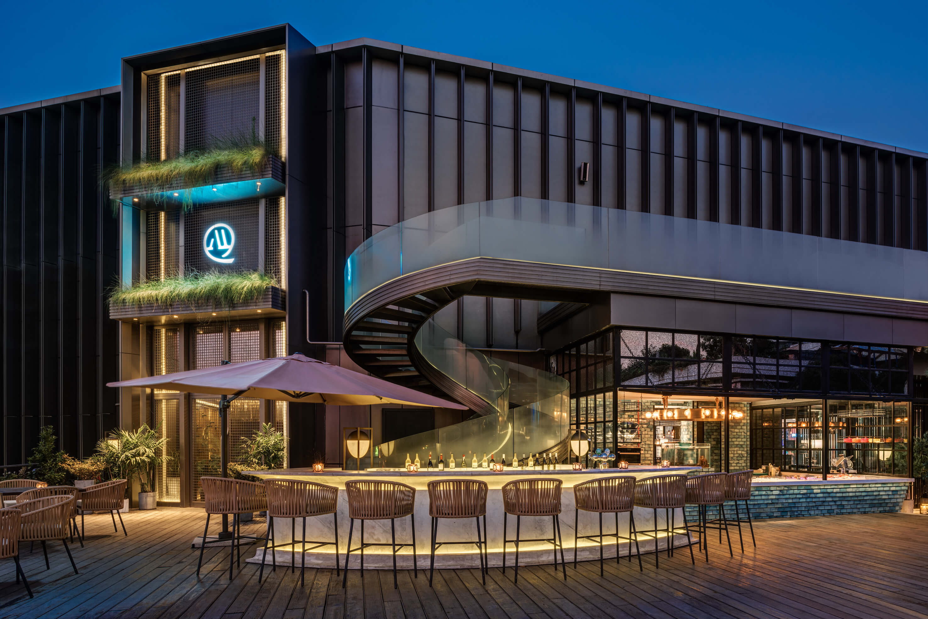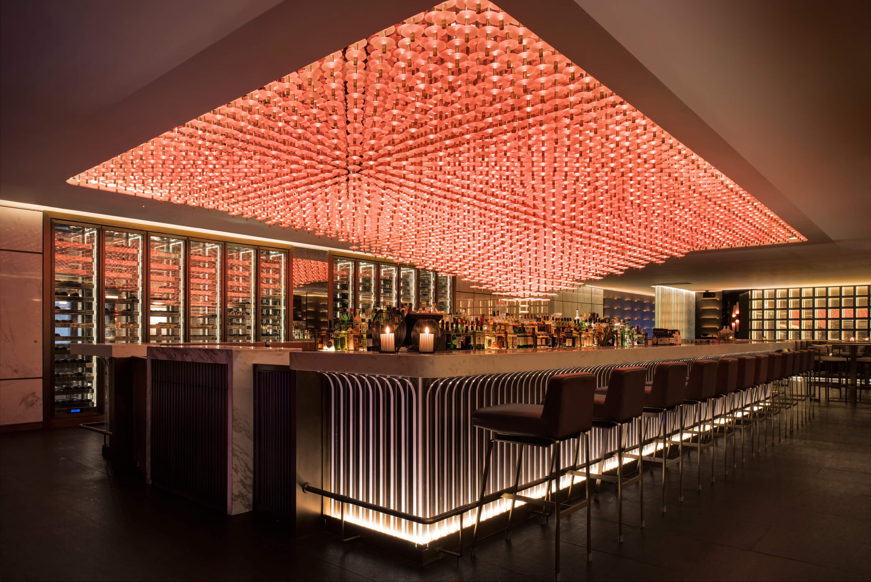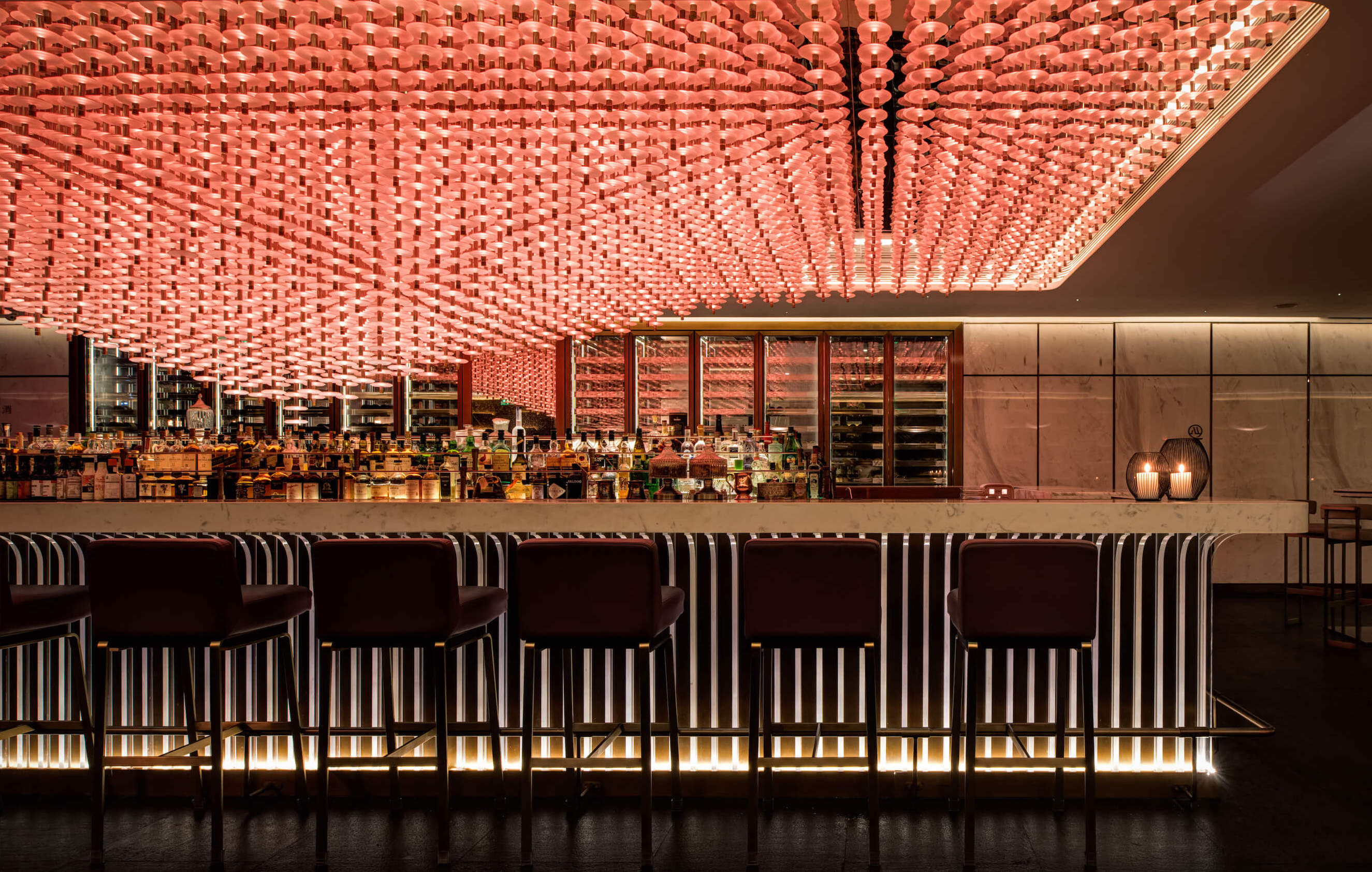 Walking past the outdoor terrace and through the fishing net decorated door, it opens up a modern upbeat speakeasy lounge. Guests are immediately drawn to the focal point of the space – The acrylic lighting that come down from the ceiling. The colour changes with the music and contributes to the dynamic atmosphere.